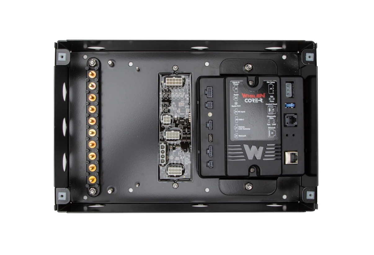 The modular design allows for quick, easy installation in tight spaces, and the durable junction box housing protects components from harsh weather. Core-R DOT integrates with a wide range of WeCanX-enabled lightbars and devices, offering limitless configurations. Core-R DOT is also compatible with Whelen Cloud Platform® (WCP®), which allows for remote firmware updates and makes it one of the most advanced control systems for DOT fleets.